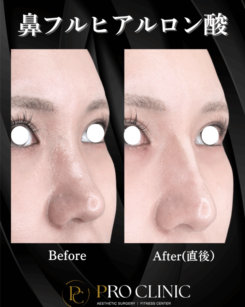 鼻筋にヒアルロン酸を注入し、スッと通った美しいラインを形成。さらに鼻中隔(鼻の穴の間の柱部分)にもヒアルロン酸を注入することで、鼻先が下方向にツンと整い、上品で洗練された印象になりました。メスを使わずに、自然な立体感とシャープさを手に入れることができました。