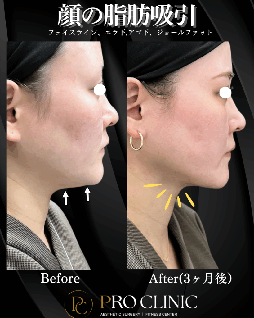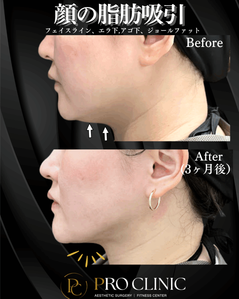 🔹 フェイスライン: 耳下から顎にかけてのもたつきを解消し、シャープなVラインを形成します。横顔の印象が劇的に変わります。